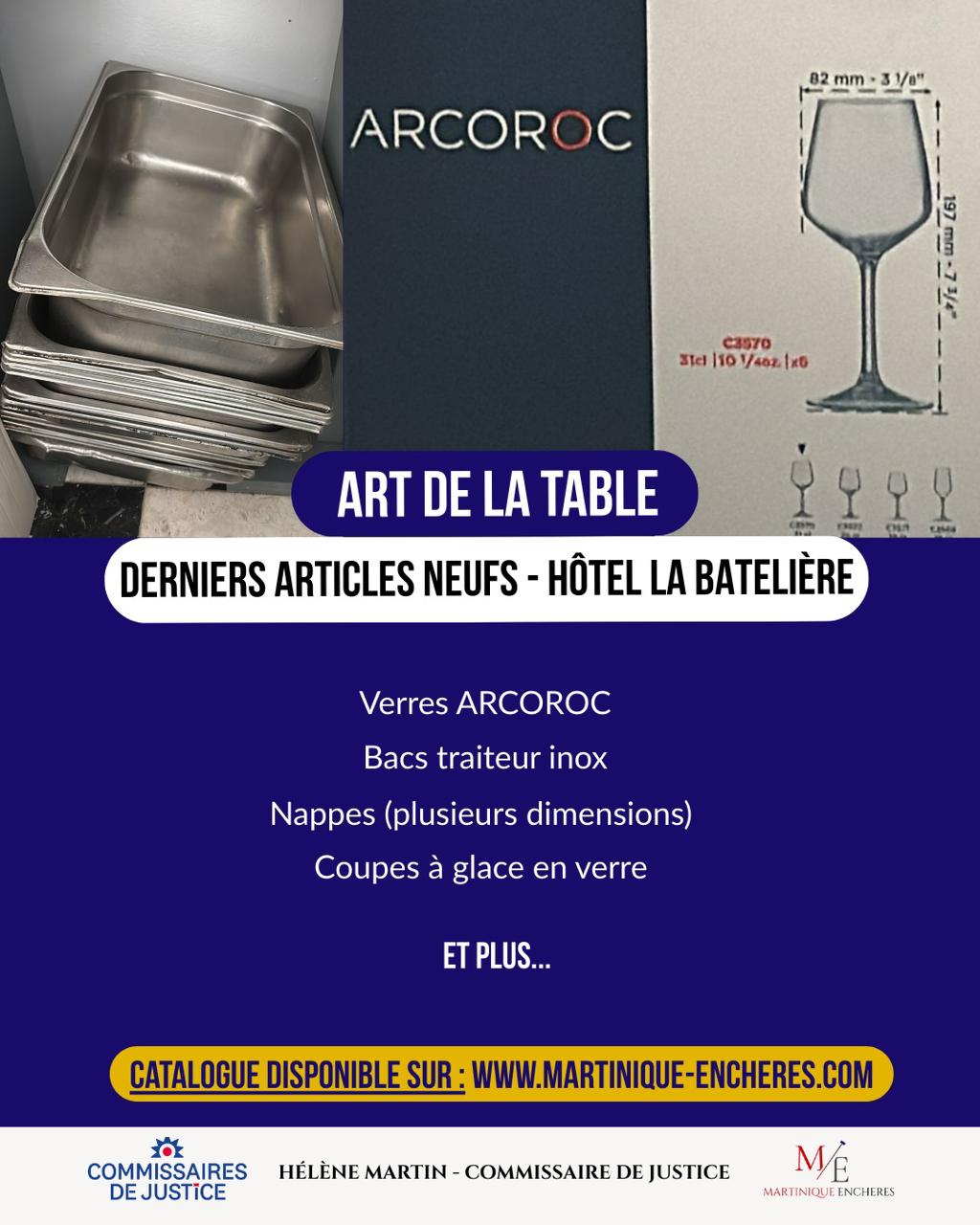 ART DE LA TABLE - DERNIERS ARTICLES NEUFS HOTEL LA BATELIERE nappes, bacs traiteur inox, verres ARCOROC
