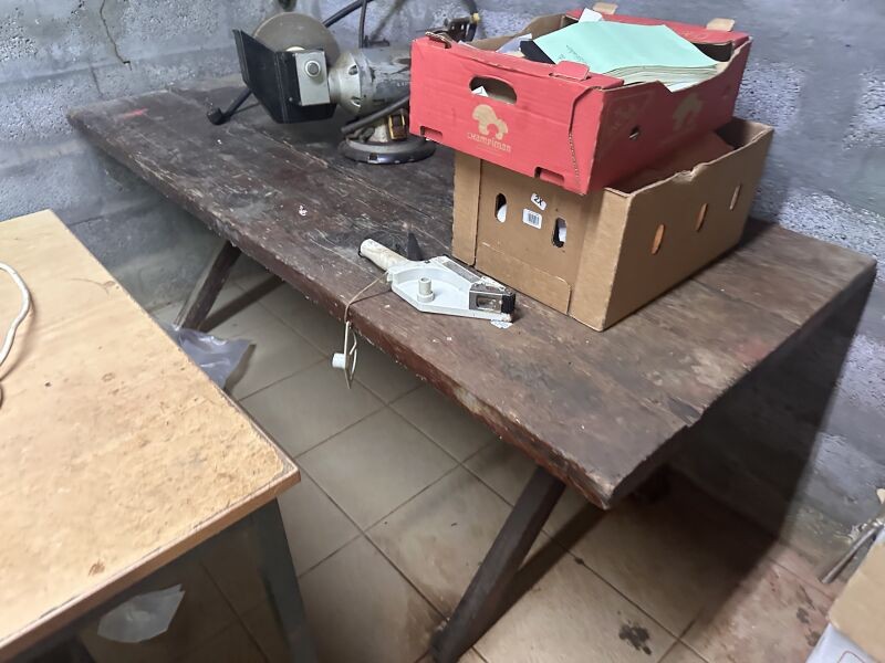 2 tables dépareillés en fibres bois et métal3 sièges dont visiteurs