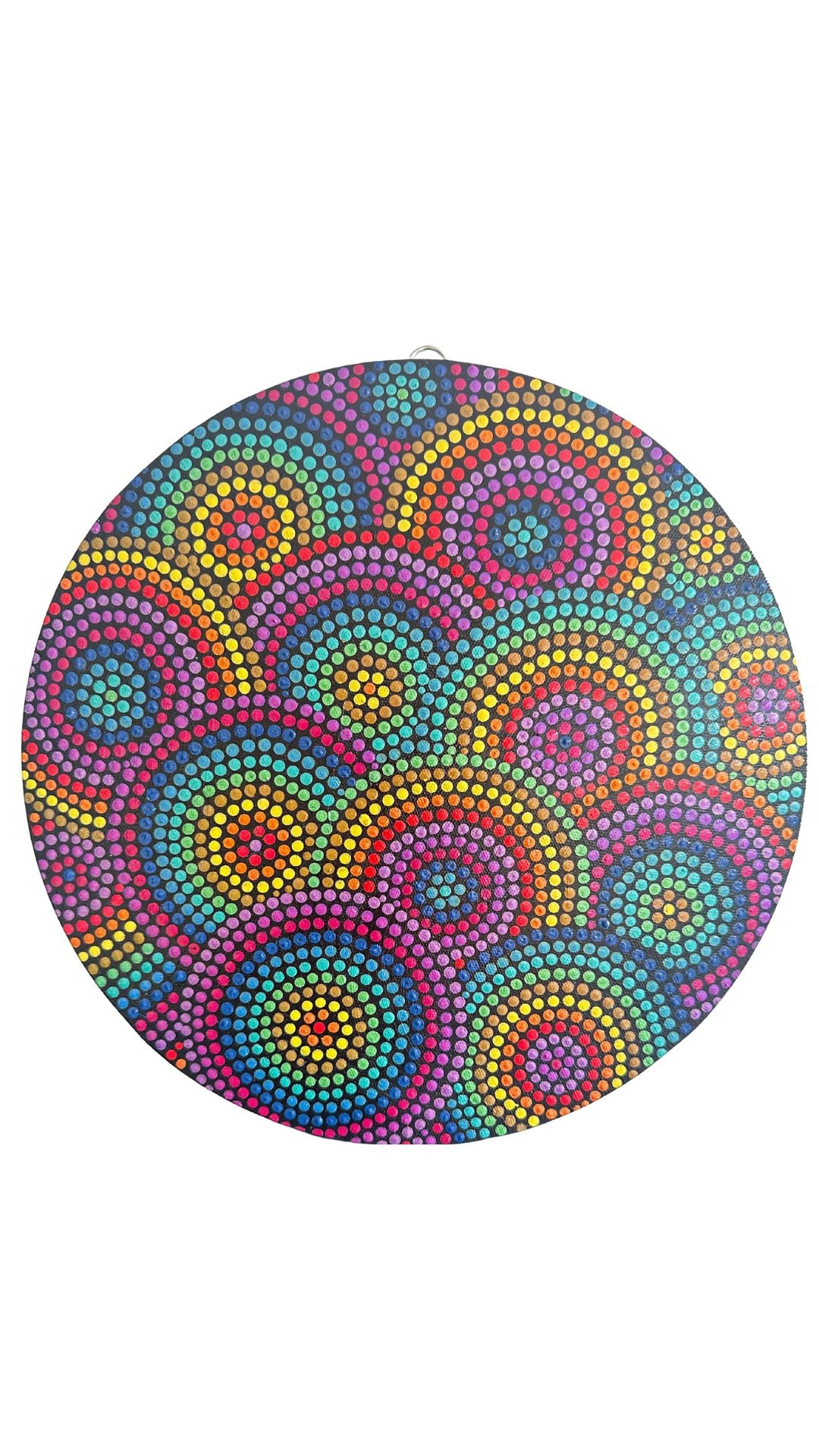 Jeune plasticienne issue du Campus Caribéen des Arts, Aurélie Argyre met à profit sa prédilection pour le châssis circulaire, en lui conférant la redondance simulée du motif cellulaire.
