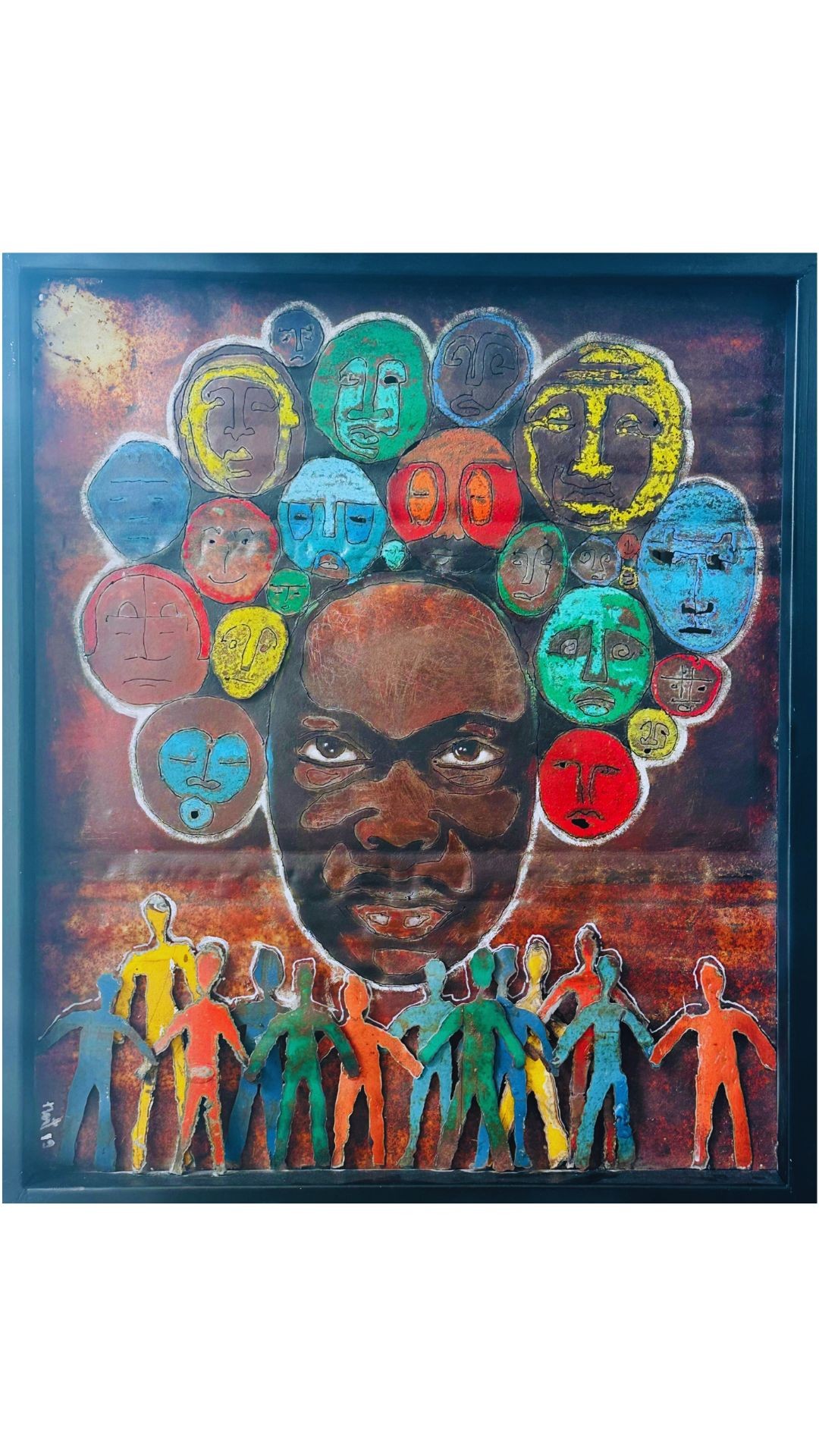 Plaque de métal estampé, découpé, ondulé et polychromé au pastel gras et en relief.
