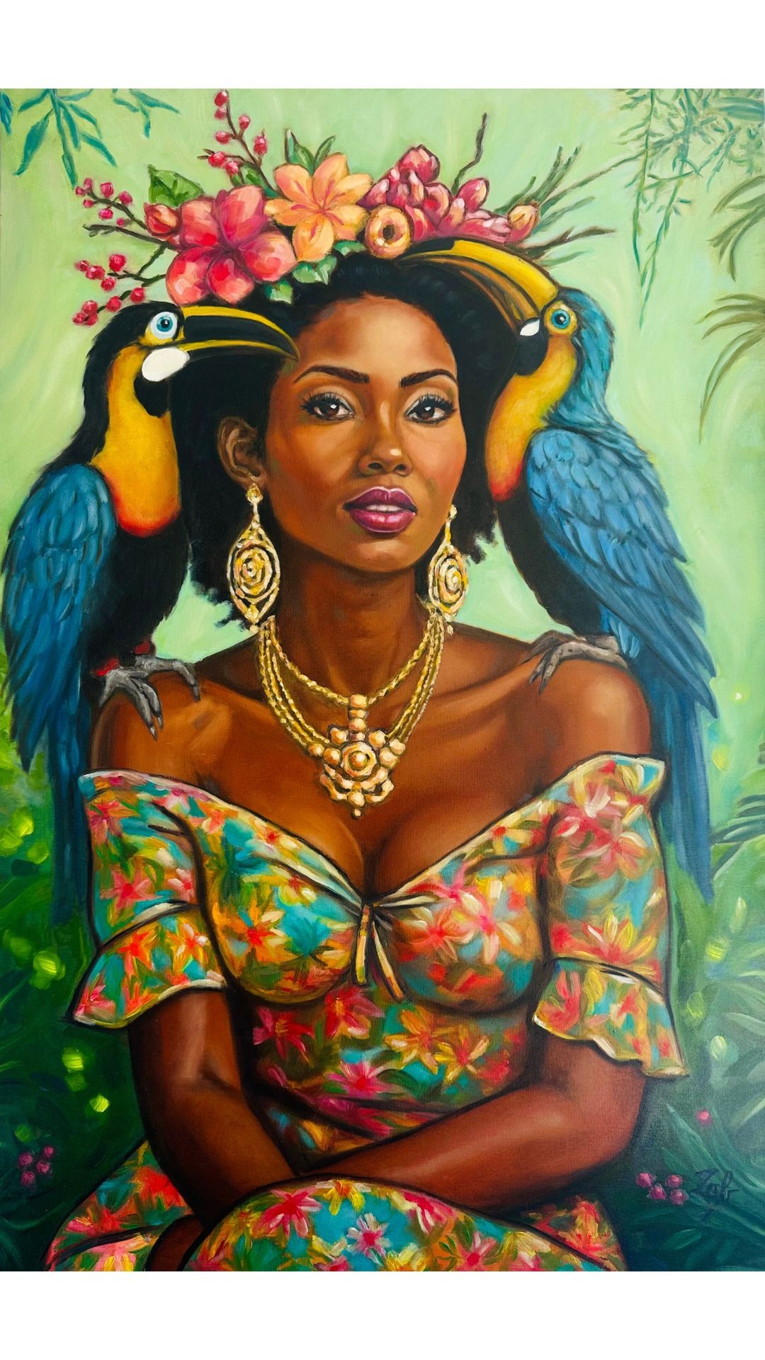 A la limite du déitique, cette femme au regard franc efface le poids des bijoux sublimant sa carnation, à la suavité palpable. Imaginaire et références culturelles créoles s'entremêlent dans cette oeuvre aux accents insaisissables et envoûtants.